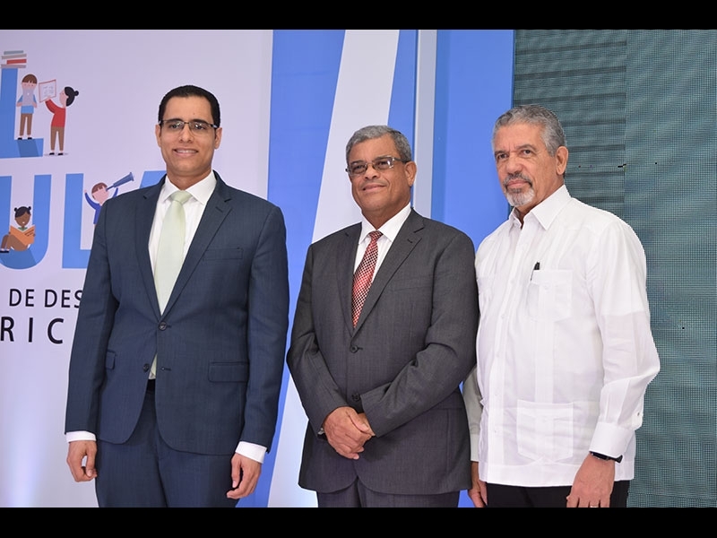 De derecha a izquierda, el director ejecutivo del IDEICE, doctor Julio Leonardo Valeirón, junto al viceministro de Supervisión y Control de la Calidad Educativa, del Ministerio de Educación, doctor Adarberto Martínez, y el doctor Juan Ariel Jiménez, ministro de Economía, Planificación y Desarrollo.