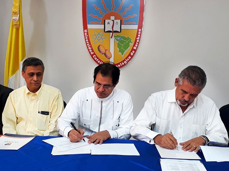 El doctor Julio Leonardo Valeirón y el reverendo padre Secilio Espinal Espinal encabezaron la firma del convenio.