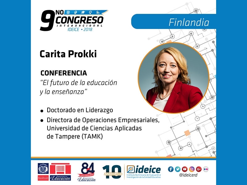 La doctora Carita Prokki tendrá a su cargo la conferencia magistral de apertura, durante la ceremonia inaugural del Congreso, este lunes 3. Se titula: "El futuro de la educación y la enseñanza". Ella es de la Universidad de Ciencias Aplicadas de Tampere, de Finlandia, país modelo de buena gestión y resultados académicos en educación.