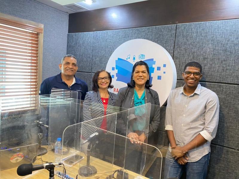 Carmen Caraballo, directora ejecutiva del IDEICE, al centro; junto a los conductores del espacio radial Alfredo Espinosa, Xiomara Tejada y Esmerlin Moreta.