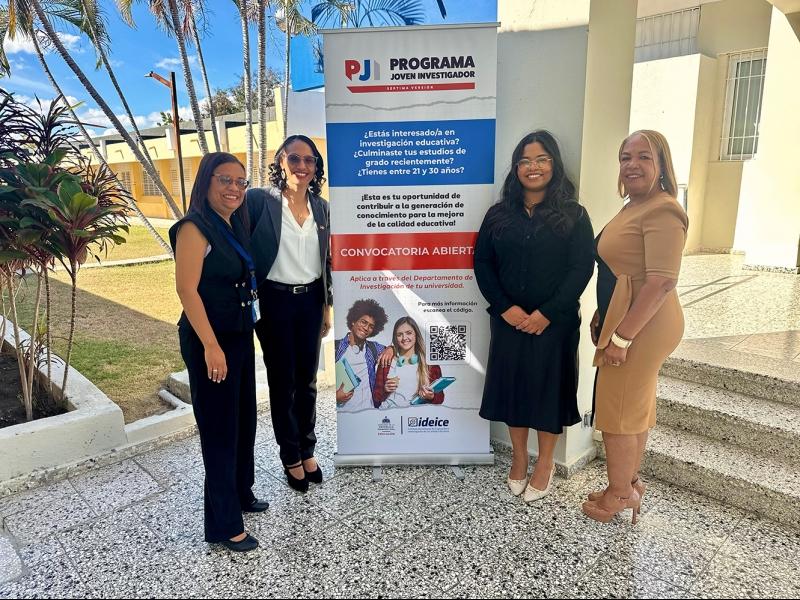 Ana Cristina Bolívar, encargada de investigación Recinto Urania Montas, del Isfodosu; Joanny Polanco y Anny Vásquez; Lesia Batista, asesora del CTRI junto al afiche que promueve el PJI en el referido recinto de San Juan de la Maguana.