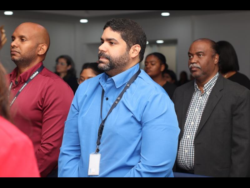 Los miembros del Consejo Técnico de Revie, analistas de datos, Francisco Acevedo García e Iván Vargas, respectivamente; y Miguel Frías Méndez, Soporte de Tecnología; quien es el encargado del departamento de Tecnología de la Información y la Comunicación del Ideice, durante la apertura de la actividad.