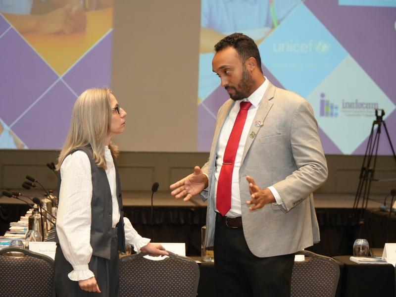 Noel Rodríguez, encargado de Evaluaciones Nacionales, socializa con Ancell Scheker, viceministra de Servicios Técnicos y Pedagógicos del Minerd, previo al evento.