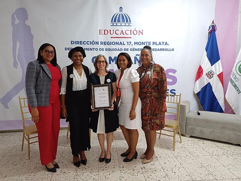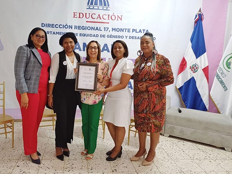 Ancell Schecker, al centro, sostiene el reconocimiento, acompañada, desde la izquierda, de Glaidira Leyba Herrera, Deisi María Marte Liriano, Mirna Dessirre Espinosa y Ángela de la Cruz.