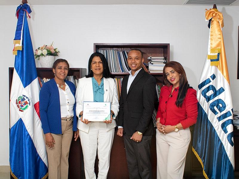 La directora del Ideice, Carmen Caraballo, posa con el certificado de buenas prácticas y cumplimiento del plan de capacitación entregado por el INAP. Le acompañan servidores del departamento de Recursos Humanos: su director, Wilson Quezada y las analistas Perfecta Ferreira y Carmen Pérez.