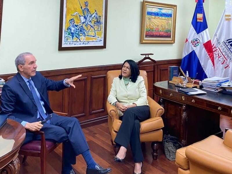 El ministro de Educación Superior, Ciencia y Tecnología recibe de manera entusiasta a la directora ejecutiva del IDEICE, Carmen Caraballo.